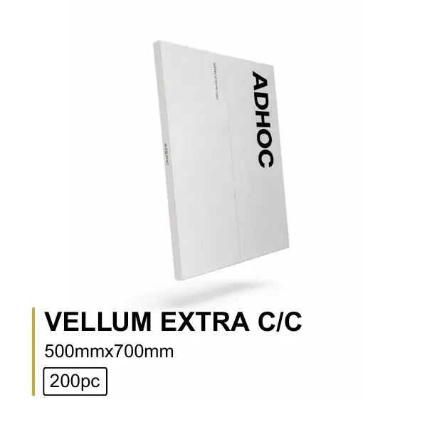 O Adhoc Vellum Extra com Cortes (50×70 cm – 200 folhas) é um papel autocolante com textura vegetal mate, com cortes pré-definidos, projetado para aplicações offset que requerem robustez, legibilidade e facilidade de uso.