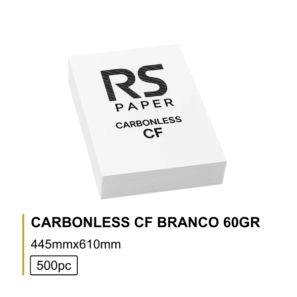 O Papel Carbonless CF 60g Branco (44,5×61 cm – 500 folhas) é a folha inferior (CF) do sistema autocopiativo, com revestimento químico na frente, que recebe a cópia da escrita ou impressão efetuada nas folhas superiores.